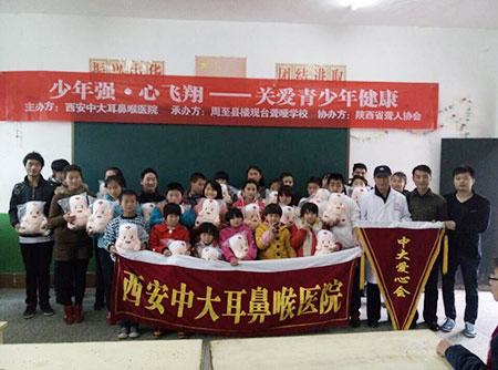 11月10日,陕西聋人协会牵头,西安新城中大耳鼻喉医院志愿者前往周至县楼观台聋哑学校开展“少年强·心飞翔--关注青少年健康”活动,对学生进行爱心授课,并向学校捐赠“爱心物资”,给聋哑儿童送去关爱和温情。