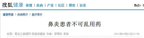 相关问卷数据显示,78%的受访者出现流鼻涕、鼻塞、打喷嚏等症状时选择自行服用药物。鼻炎类疾病症状与感冒类似,患者常常误将其当成感冒,凭自己对病情的判断或是之前的用药经验购药。一些鼻炎类疾病患者服用较多的药物大多数是广告宣传力度大的药物,而出现以下病症: